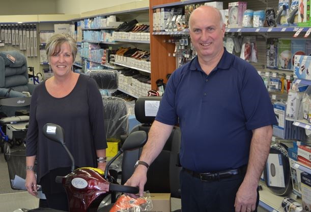 OPEN FOR BUSINESS – Walsh’s Heath & Lifestyle Centre is now open for business at 101 Main Street S. in Mount Forest. The store opened on April 26, and features 1,200 square feet of home health care products. Pictured at the store last week are, from left: Nancy Hartman, home health care specialist and owner Joe Walsh. - Mike Wilson/Metroland Photo